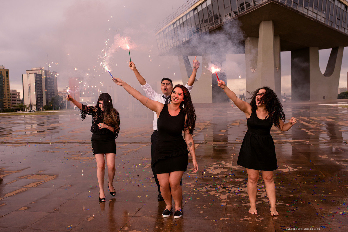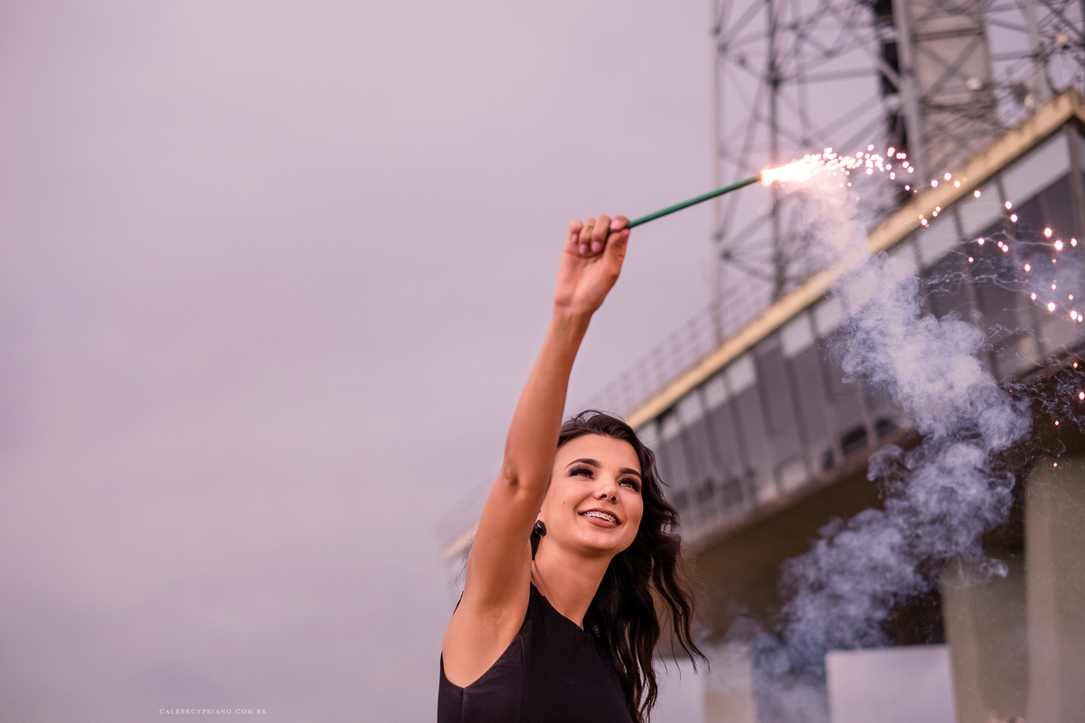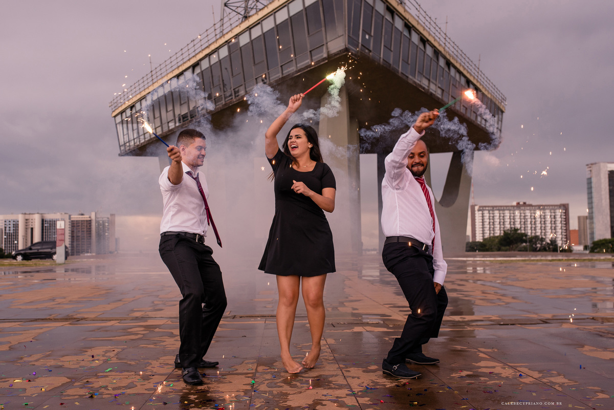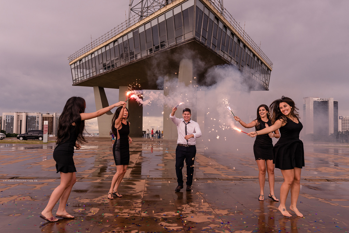 O segurança da Torre de TV, incrivelmente, liberou nossa entrada até o mezanino. Como foi algo exclusivo, acabamos conseguindo fotos bem legais. Logo depois, descemos, ligamos os fogos, estouramos os confetes, e finalizamos de uma forma super bacana, garantindo que esse fosse um ensaio incrível.